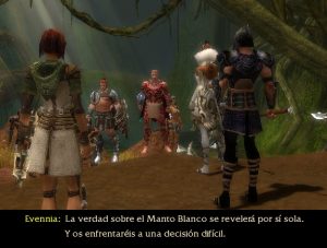 Al final, la discusión se resuelve cuando Evennia, líder de la Hoja Brillante, nos invita a viajar hasta la piedra del pantano de los Hematites, donde «la verdad será desvelada por sí sola»