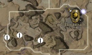 En esta cooperativa saldrán 3 de estos 6 jefes al azar, es decir, que en una partida pueden salir el monje, el guarda y el hipnotizador; y en otra partida pueden salir en cambio el guerrero, el elementalista y el nigromante. Encontrarás a estos jefes en los puntos marcados con el número 1 en el siguiente mapa, cortesía de www.guildwarsguru.com