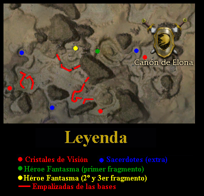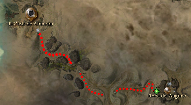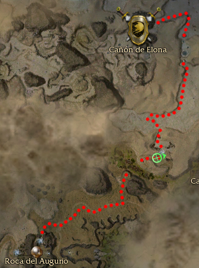 En la Roca del Augurio habla con el Sumo Sacerdote Zahmut, que te conducirá a la explanada de la roca. Allí encontrarás un total de 3 NPC, y cada uno te dirá que tienes que hacer una misión diferente. El de la izquierda, el Comandante Joziah, te explicará que la primera prueba consiste en ir al Norte, al Cañón de Elona, juntar los tres fragmentos del Cristal de Visión y recomponerlo. No nos aparecerá ninguna señal en el mapa de cómo llegar. El camino más corto desde Roca del Augurio es el siguiente: