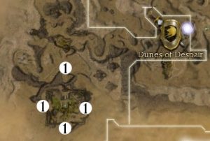 En esta cooperativa saldrán 3 de estos 4 jefes al azar, es decir, que en una partida pueden salir el monje, el guerrero y el hipnotizador; y en otra partida pueden salir en cambio el monje, el guerrero y el nigromante. Encontrarás a estos jefes en los puntos marcados con el número 1 en el siguiente mapa, cortesía de www.guildwarsguru.com