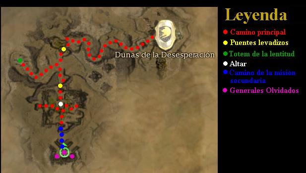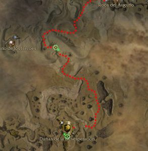 En la Roca del Augurio habla con el Sumo Sacerdote Zahmut, que te conducirá a la explanada de la roca. Allí encontrarás un total de 3 NPC, y cada uno te dirá que tienes que hacer una misión diferente. El de la izquierda, el General Mendoza, te explicará que la segunda prueba consiste en ir al Suroeste, a las Dunas de la Desesperación, donde deberás reclamar el Templo de la Ascensión y despertar a los dioses. No nos aparecerá ninguna señal en el mapa de cómo llegar. El camino más corto desde Roca del Augurio es el siguiente: