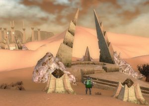 Una de las 3 pruebas de la Ascensión nos ha conducido hasta Las Dunas de la Desesperación. El paisaje yermo del desierto de Cristal sólo está salpicado por ruinas altas y con formas sorprendentemente urbanas en recuerdo de aquellos que fracasaron en su intento de completar la Ascensión. Fabricados con los barcos que los trajeron hasta estas costas y con ladrillos hechos de arena y barro, los edificios han resistido al duro desierto de forma asombrosa… no ha sido así con los que los construyeron: El Templo fue tomado hace ya tiempo por los Olvidados.