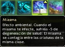 Cuando entremos en la miasma, quedaremos «malditos» y sufriremos una degeneración de -5, que además se contagiará. Si tenemos poco nivel (y por tanto, poca salud), podremos morir fácilmente por las degeneraciones: