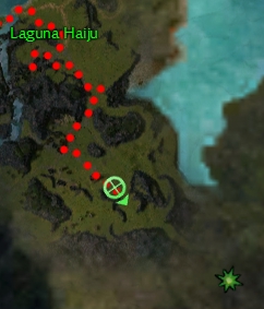 b) Si has creado un personaje de PvE para el episodio 2 «Factions», podrás hacer esta cooperativa. Para ello, sigue el curso de las misiones principales, y al final coge la misión «a Zen Daijun», que te dará Su en Laguna Haiju. Deberás acompañar a los NPC hasta la puerta, que está cerrada y te la abrirá el guardia, dándote acceso a esta cooperativa. El mapa a seguir es el siguiente:
