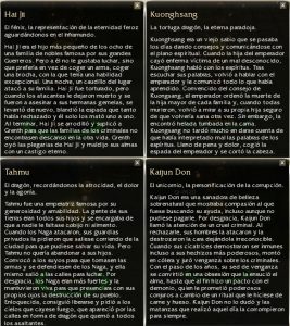 – Kuonghsang, (tortuga celestial nigromante): Balanza de Grenth, grifo de vida, pozo de cansancio, mirada de desprecio