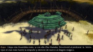 No será fácil. Cuando llegamos a Lecho de Cierzo veremos que ese día se celebra la llamada «Asamblea». La Asamblea es un torneo entre los héroes de los 3 clanes luxon: tortuga, cangrejo y serpiente. Una vez al año, estos clanes pelean a muerte, y el ganador del torneo deberá tomar la lanza y derrotar con ella a Zhu Hanaku, el monstruo marino que aterroriza al mar de jade. Una vez derrotado el monstruo, nos convertiremos en portadores legítimos de la lanza y podremos usarla para batir a Shiro, pero antes… habrá que luchar por ella.