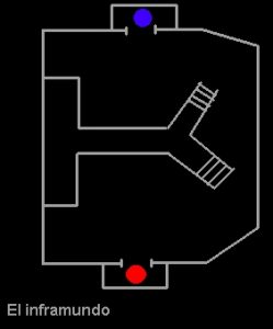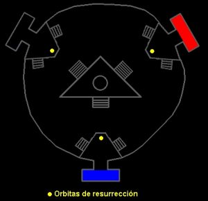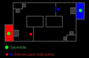 El plano no se corresponde al 100% con la realidad, porque es bastante extenso y muy complicado de dibujar en detalle debido a la gran cantidad de escalinatas, puentes y detalles que hay, además de existir una cierta rotación de algunos elementos para tratar de hacerlo más esférico y menos cuadrangular. En cualquier caso, la parte superior está comunicada entre sí, y por ahí se puede ir deslizando algún personaje en solitario que mate a los sacerdotes enemigos… o te lo maten a ti.