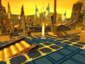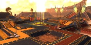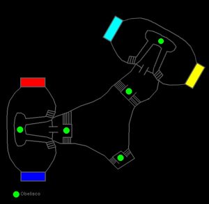 La zona se divide en 4 (ahora 3) zonas: una zona «común», y 3 (ahora 2) zonas preparadas para una lucha entre dos equipos. El mapa actualmente está diseñado a modo de «mini–torneo», es decir que vendría a ser como unas semifinales en el que el equipo rojo se enfrenta al azul, y el equipo amarillo se enfrenta al equipo turquesa (siempre es esa secuencia). Las zonas están separadas por puertas. Cuando un equipo elimina a su rival, se abre la puerta que da acceso a la zona común. Hay también obeliscos que se pueden capturar por medio de banderas (las cuales no están en la base, sino en mitad del campo de batalla).