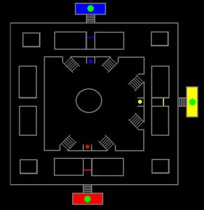 Finalmente, es importante destacar la presencia de botones para abrir las puertas, pero que se abren desde fuera, a diferencia del mapa anterior que se abrían desde dentro. Suele ser un error por parte de los equipos ir en línea recta pensando que se abrirá la puerta, pues pierden un tiempo valioso y no se puede capturar de esta manera el altar; a la hora de la salida, hay que tomar uno de los caminos accesorios.