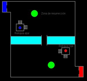 Este mapa es muy táctico, y aquí lo más importante es capturar reliquias enemigas, defender la reliquia propia y no ir a matar al enemigo. Importante: no podrás llevar en brazos tu propia reliquia. Si matas a un enemigo que portaba la reliquia, ésta caerá al suelo, y al hacer click sobre ella, ésta volverá a nuestra base.