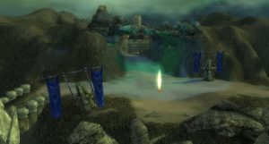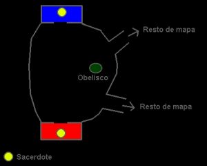 Zona de combate inicial. A derecha e izquierda estarían ubicadas las bases de cada uno de los equipos. Las banderas se encuentran en medio, y el recorrido necesario para capturar este obelisco es tan largo que por regla general, no merece la pena capturarlo.